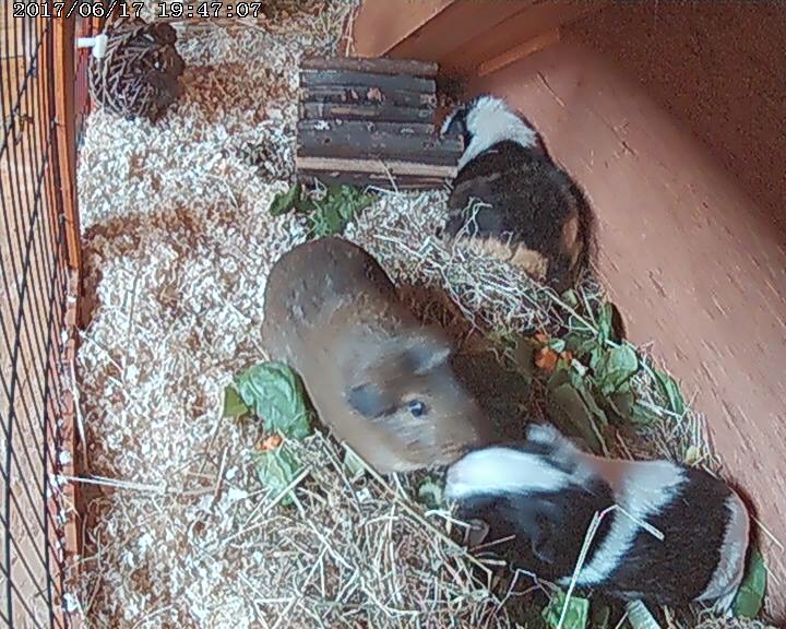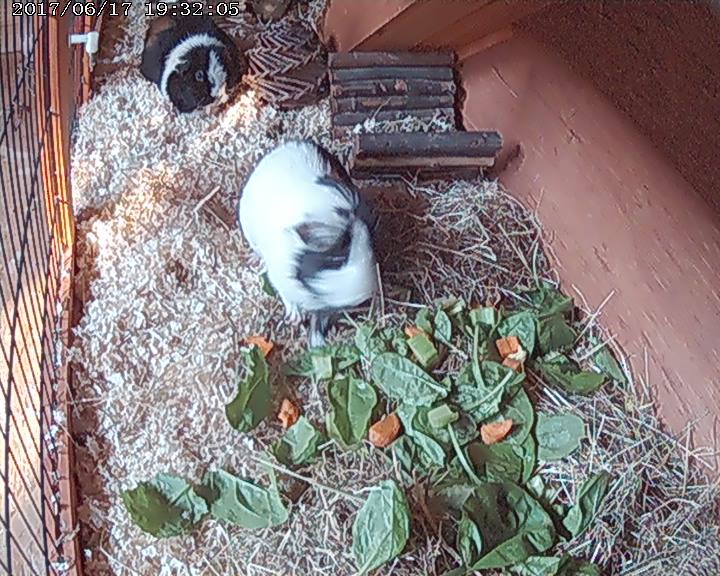 Kevin and Keith having a nibble in their outside hutch at the Guinea Pig Hotel.